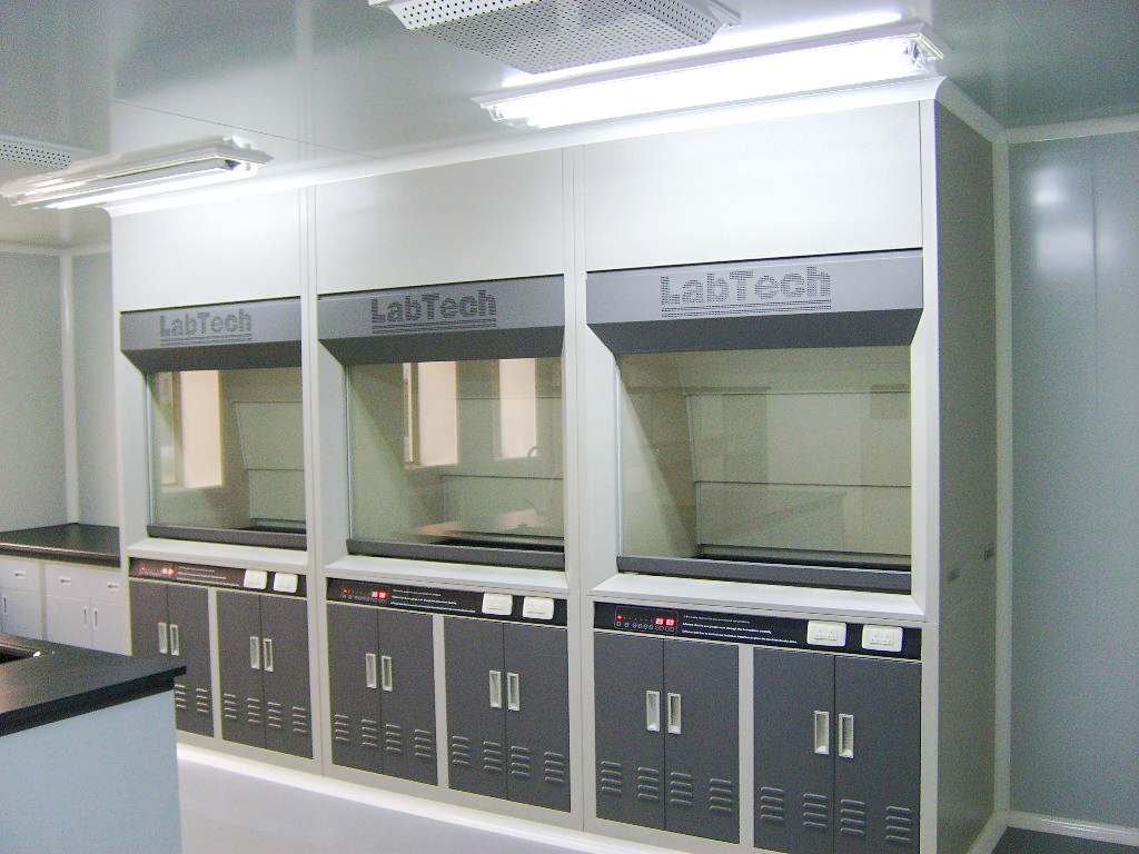 Interior walls have no exposed metal parts (except stainless steel fume hoods); they are modular assemblies without screws or fasteners.