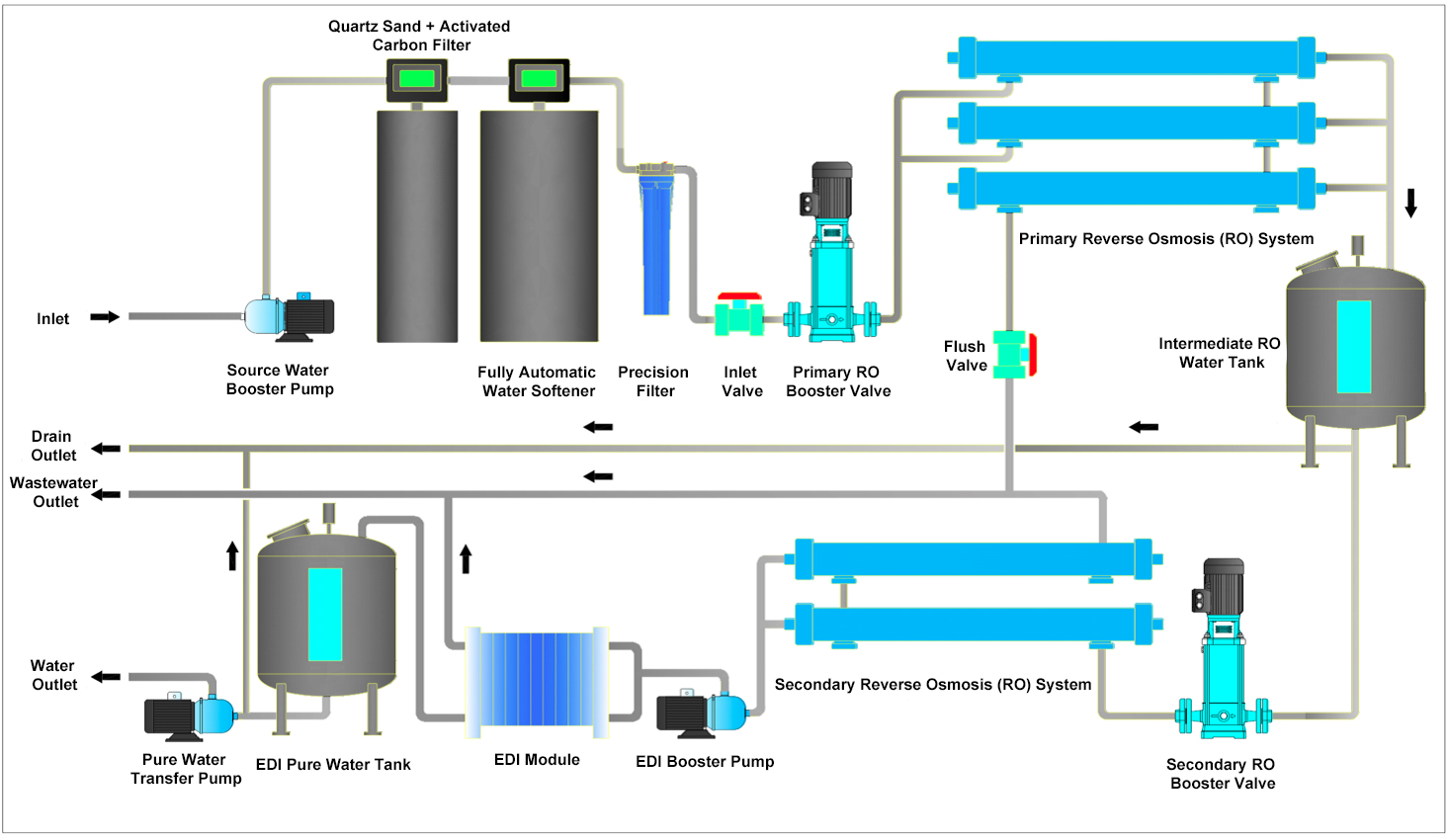 To avoid bacterial growth, particle deposition, and contamination of ultrapure water quality caused by leachables from the piping, the flow rates are designed as follows: Main pipeline: 1.5–3 m/s, Branch pipeline: 1–2 m/s.