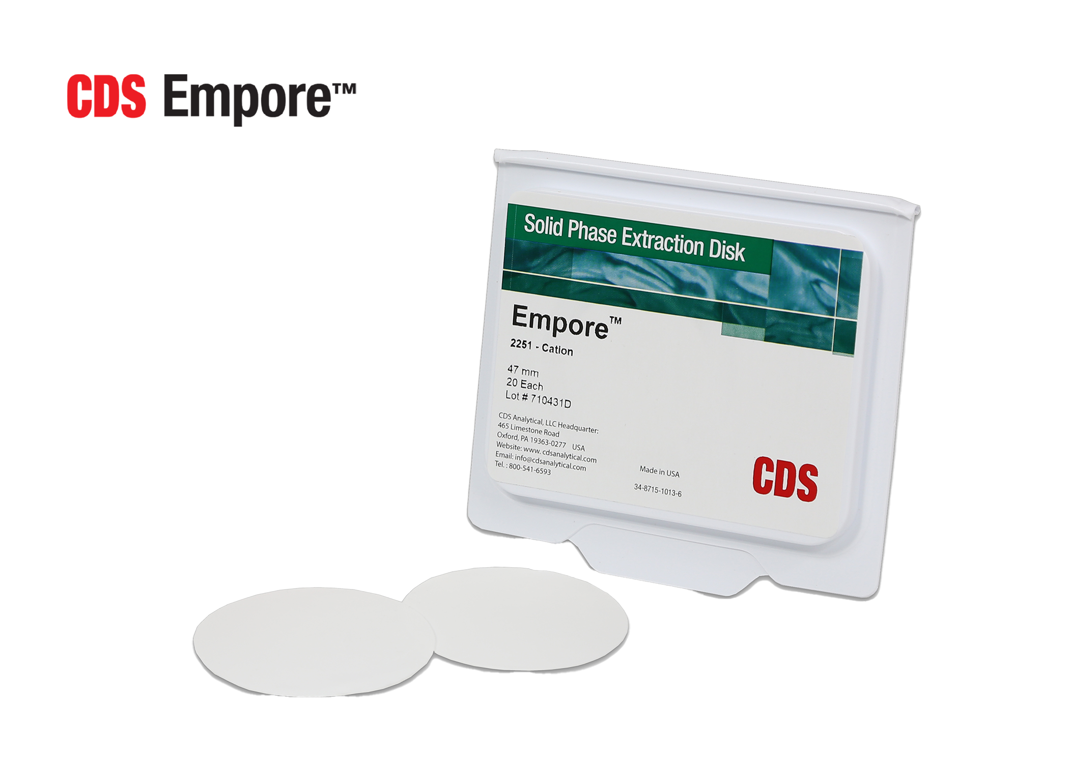 CDS Empore 2251 Environmental Cation Disks are polymer-based strong cation exchange solid phase extraction (SPE) disks with a 12 μm particle size, designed for extracting positively charged ions from aqueous solutions. These disks offer effective extraction and recovery of primary, secondary, and some tertiary amines, as well as most metal cations. Suitable for samples with pH range 1–14. Not recommended for quaternary amines.