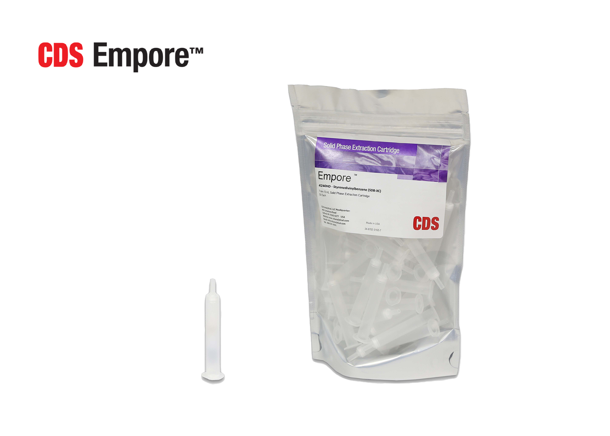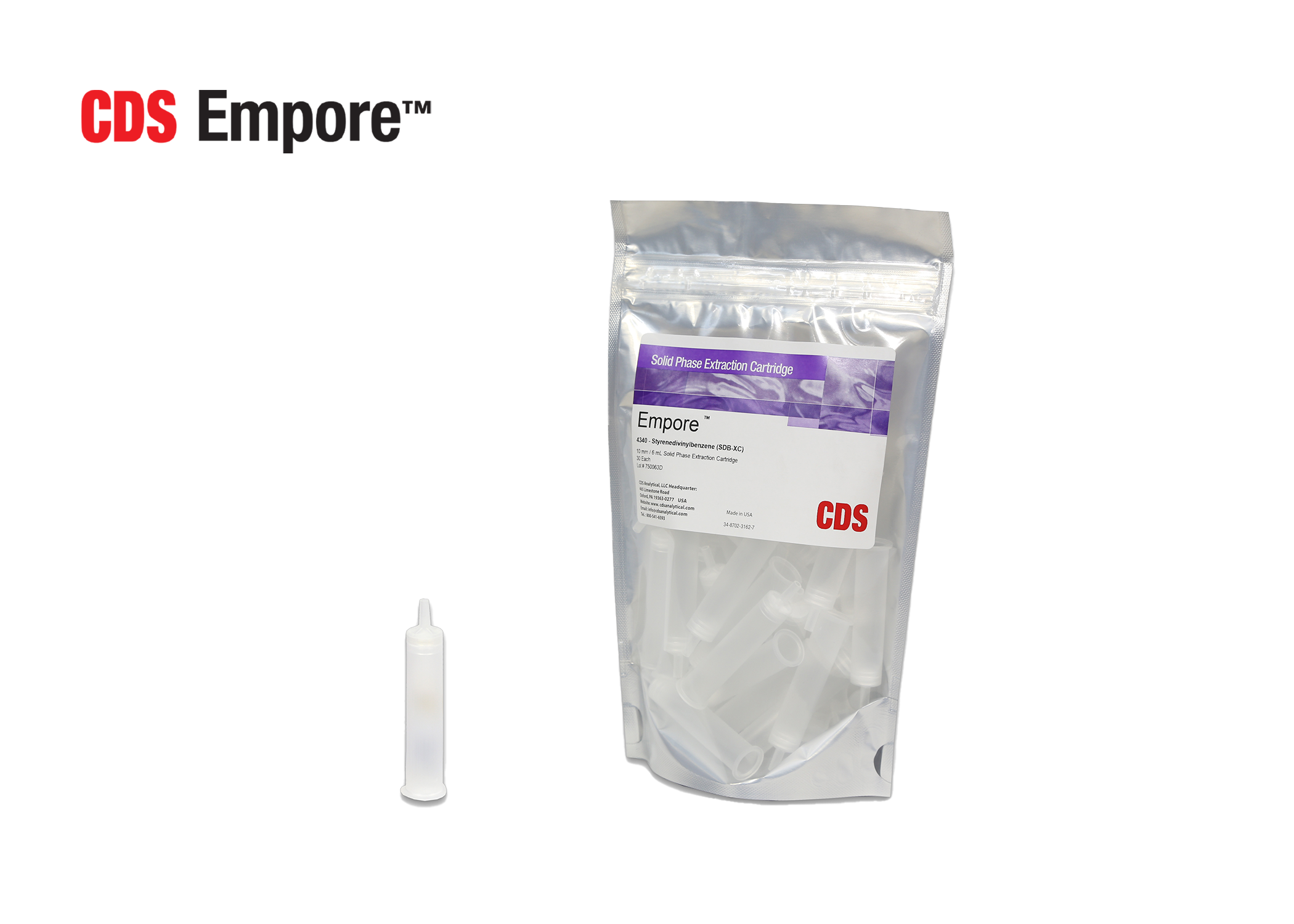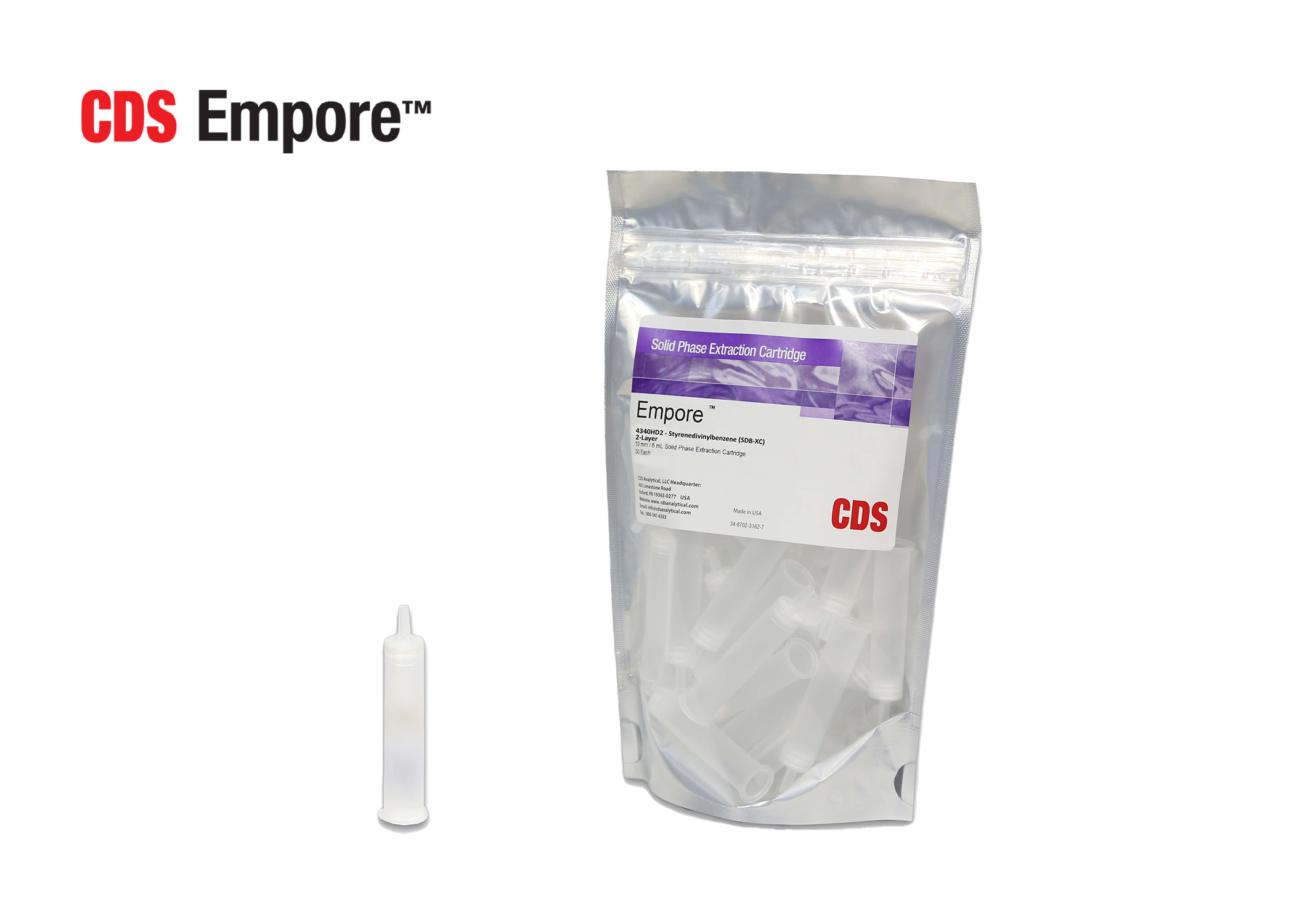 CDS Empore SDB-XC solid phase extraction (SPE) cartridges are made from high-density polystyrenedivinylbenzene with a 12 μm particle size. These cartridges are ideal for moderate non-polar or aromatic analyte extraction and are suitable across a wide pH range of 1–14. Available in single-layer and 2-layer configurations, they meet EPA 515.2 and similar method requirements calling for SDB sorbents.